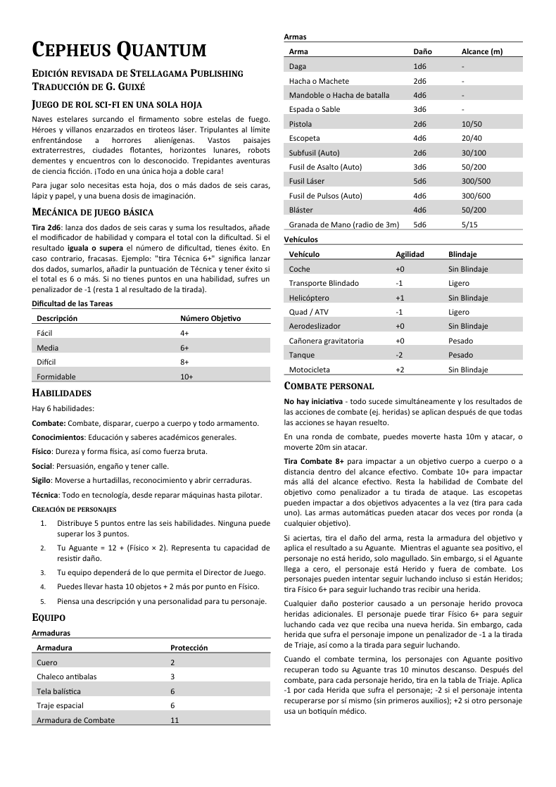 Cepheus Quantum es un juego de rol de ciencia ficción completo en una sola hoja a doble cara, diseñado para partidas rápidas, fácil de aprender y cargado de acción.